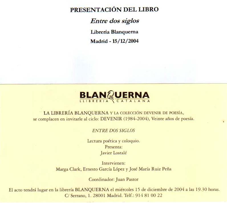 Pero después ojeé el programa de actos que con esta ocasión se han desarrollado en Madrid, Sevilla, Barcelona, Burgos y Zaragoza, y al llegar al final del programa leí los nombres de los 185 autores que han participado en esta colección y los títulos de sus poemarios y encontré tal afinidad en las sensibilidades de sus contenidos que me pareció curioso, interesante o quizá divertido, no se qué adjetivo poner, el crear algunos poemas usando los títulos como versos. De manera que empezando por el número 120 y siguiendo hasta el 149, respetando el orden cronológico en que se han publicado, he compuesto, a manera de pequeño homenaje a esta colección, varias composiciones de verso libre que ahora os leo: